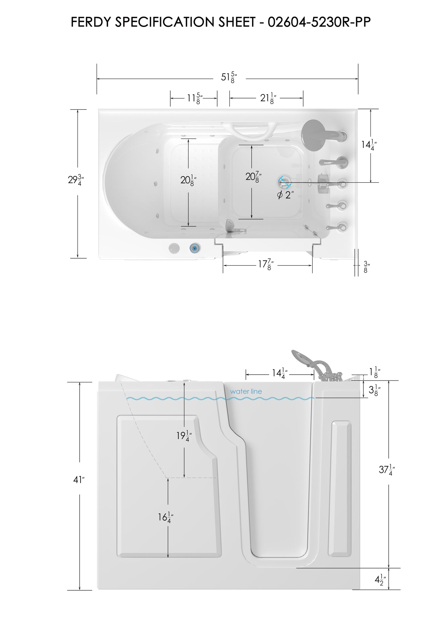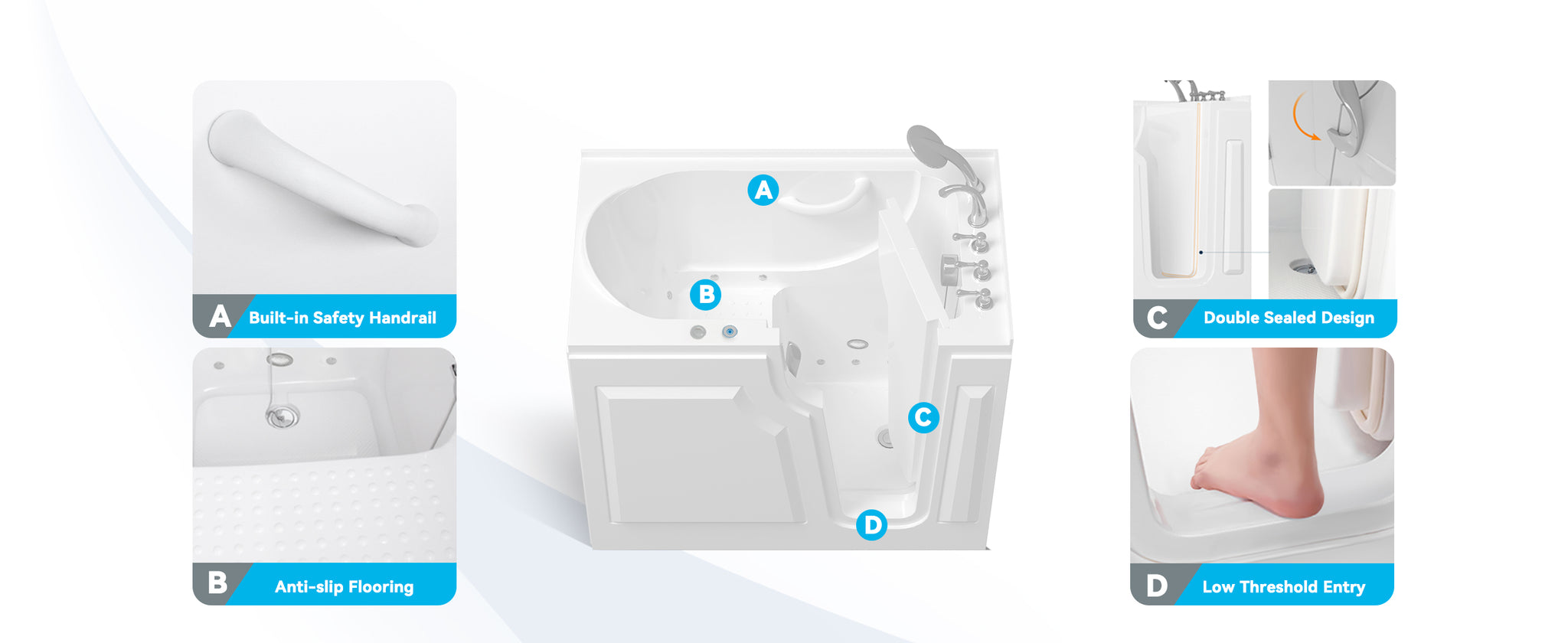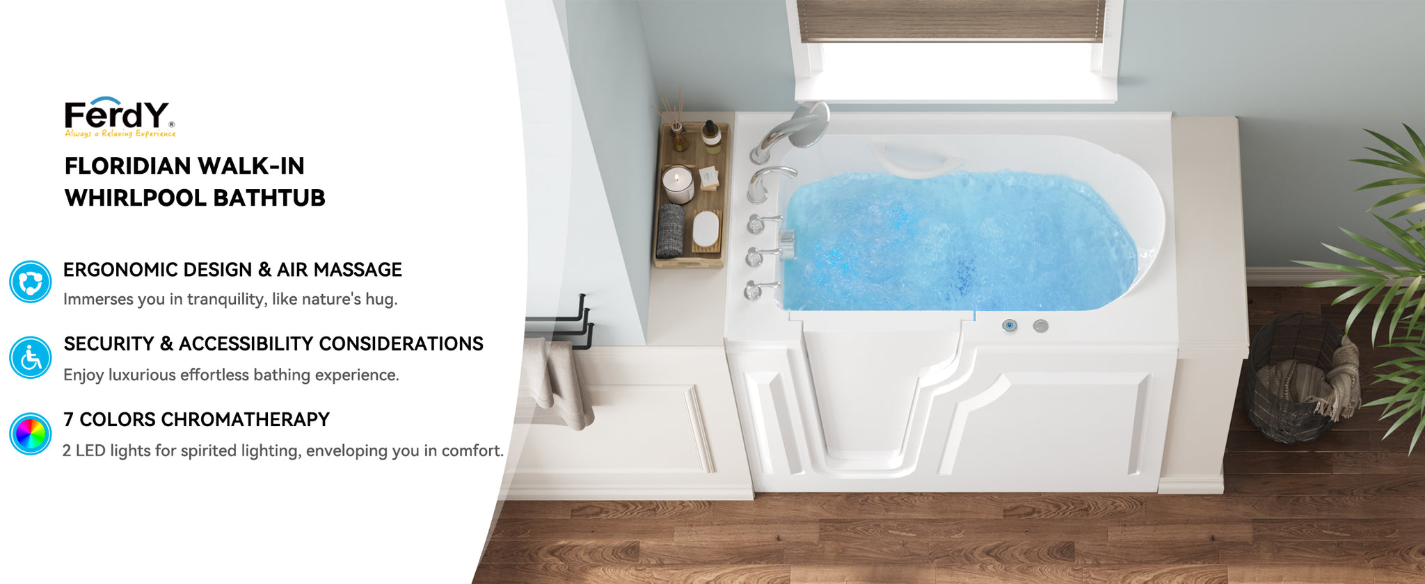 - 【EXTRA-WIDE DOOR & LOW STEP-IN】The FerdY Floridian Walk-in Bathtub provides an easily accessible bathing experience. Added features include Left or Right-side opening option, an easy-to-turn door handle, and a watertight seal to prevent water leaks and wet bathroom floors. At approx. 4" tall, our bathtub provides the lowest walk-in threshold on the market for its price and value today, as well as meeting the minimum required compliance threshold from cUPC Standard.