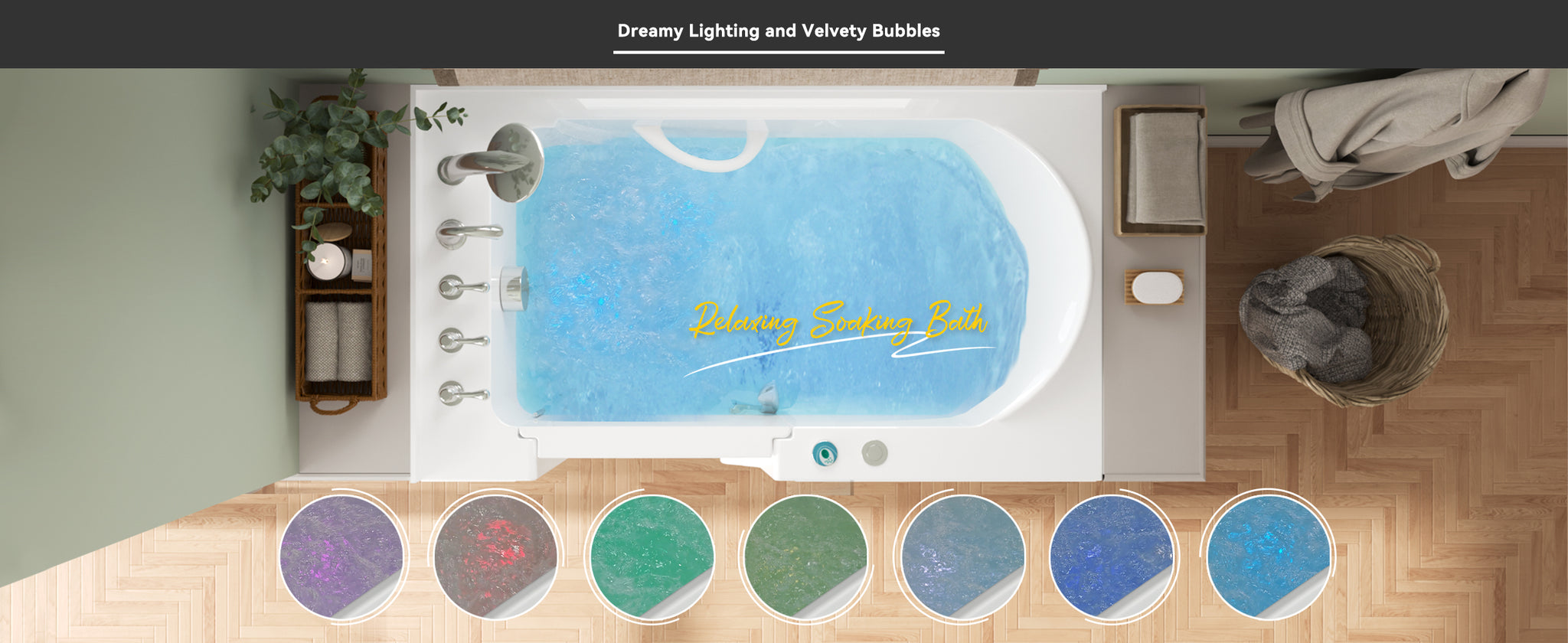 - 【CHROMATHERAPY LIGHTING WHIRLPOOL】The Whirlpool Bathtub features color therapy with 2 LED lights, one press to smoothly switch between 7 colors, two presses to lock a single color, and two more presses to switch colors. Two button starts the dreamy, colored bubble soaking bath.
