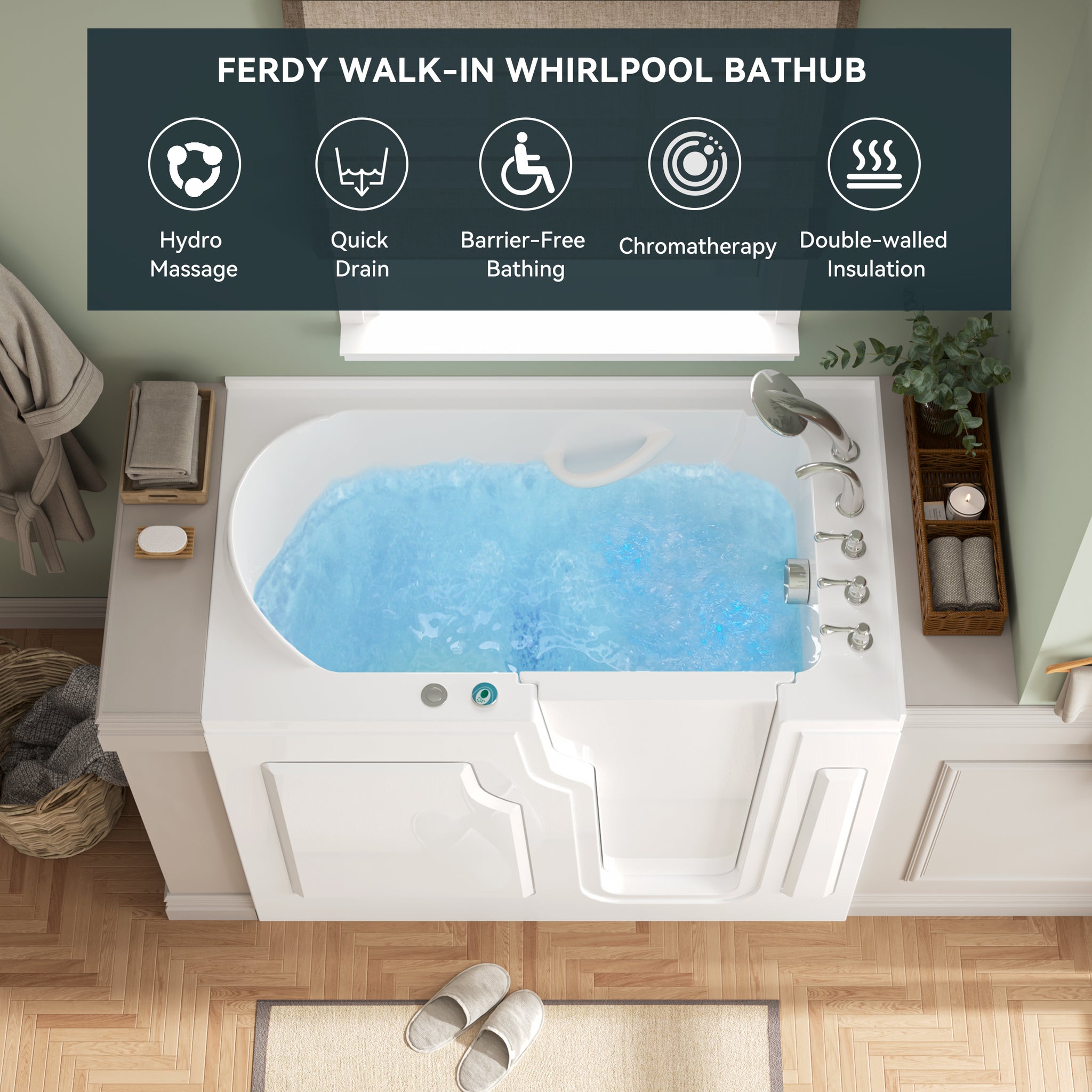 - 【EXTRA-WIDE DOOR & LOW STEP-IN】The FerdY Floridian Walk-in Bathtub provides an easily accessible bathing experience. Added features include Left or Right-side opening option, an easy-to-turn door handle, and a watertight seal to prevent water leaks and wet bathroom floors. At approx. 4" tall, our bathtub provides the lowest walk-in threshold on the market for its price and value today, as well as meeting the minimum required compliance threshold from cUPC Standard.